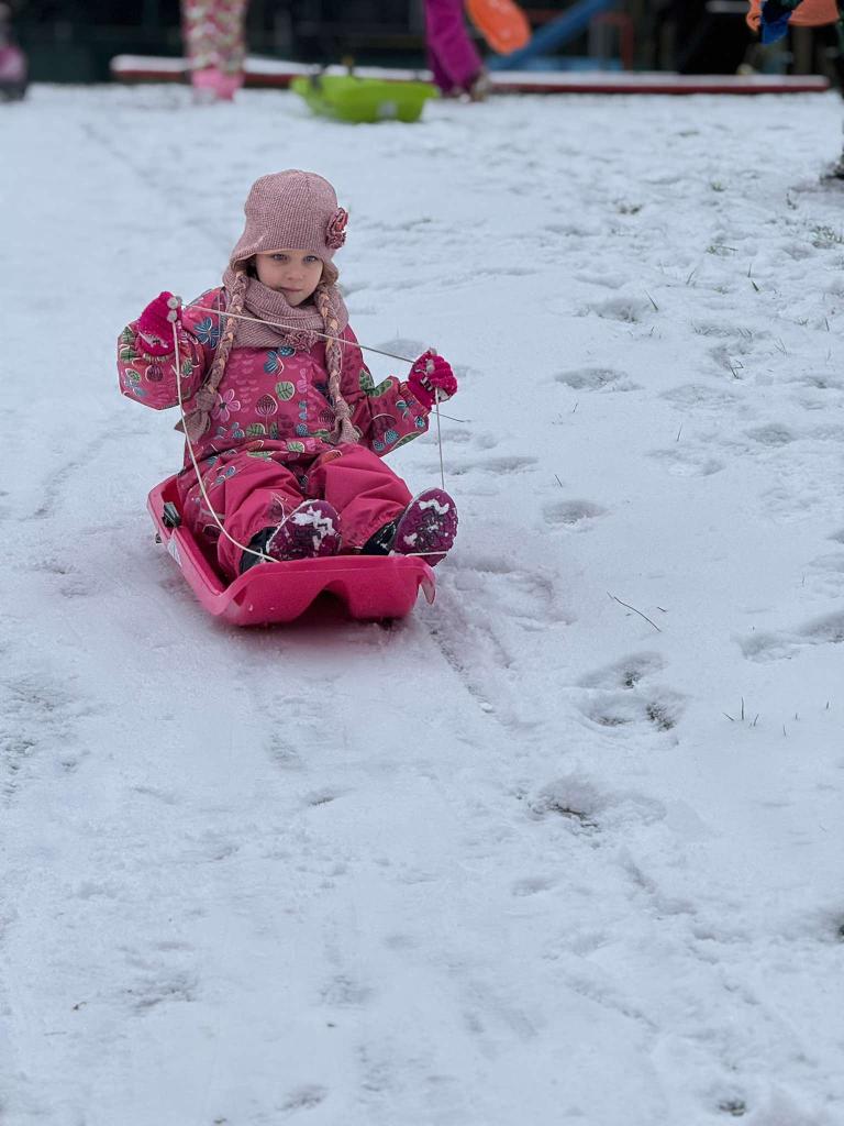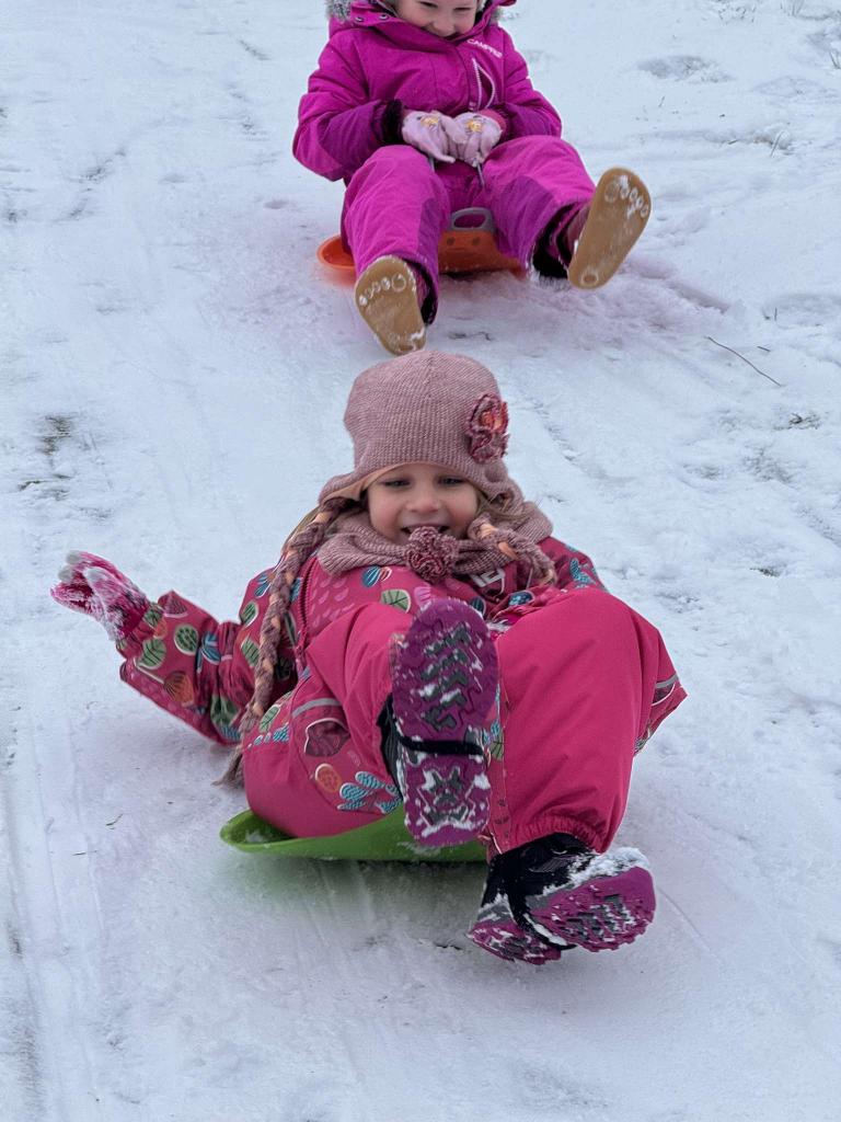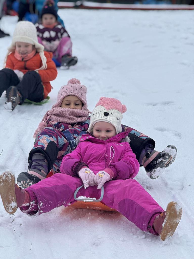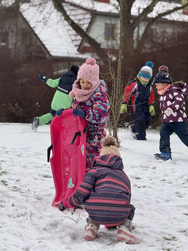 Jedou sáňky, na nich děti,