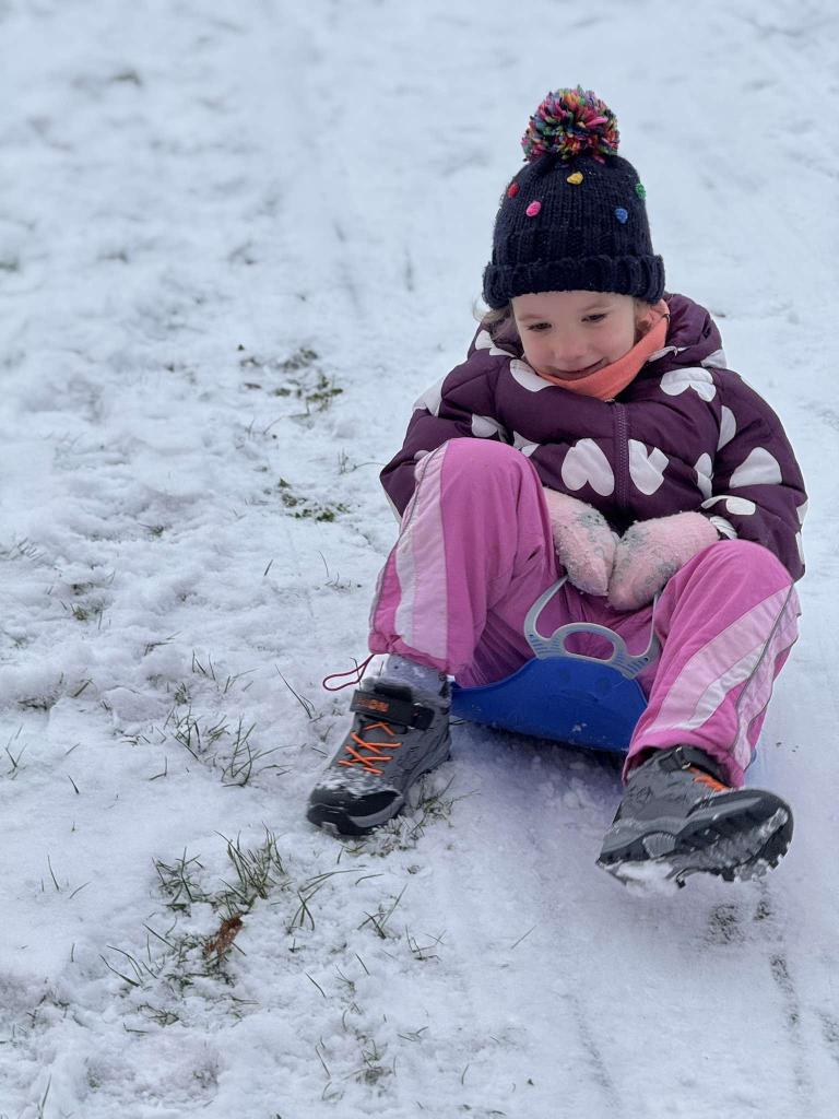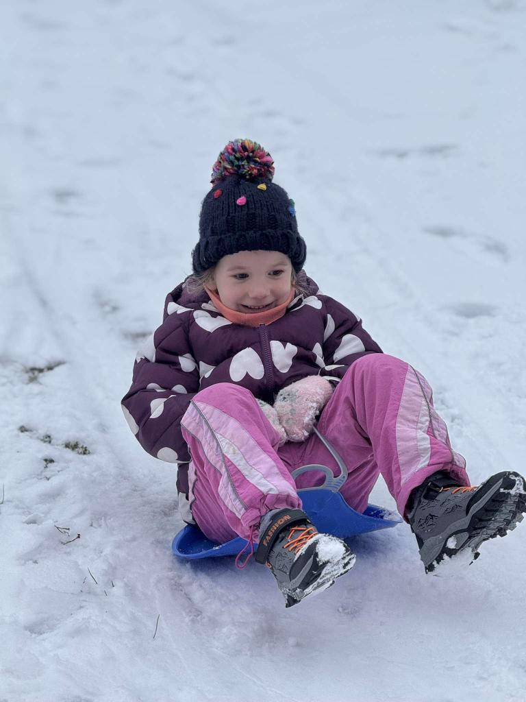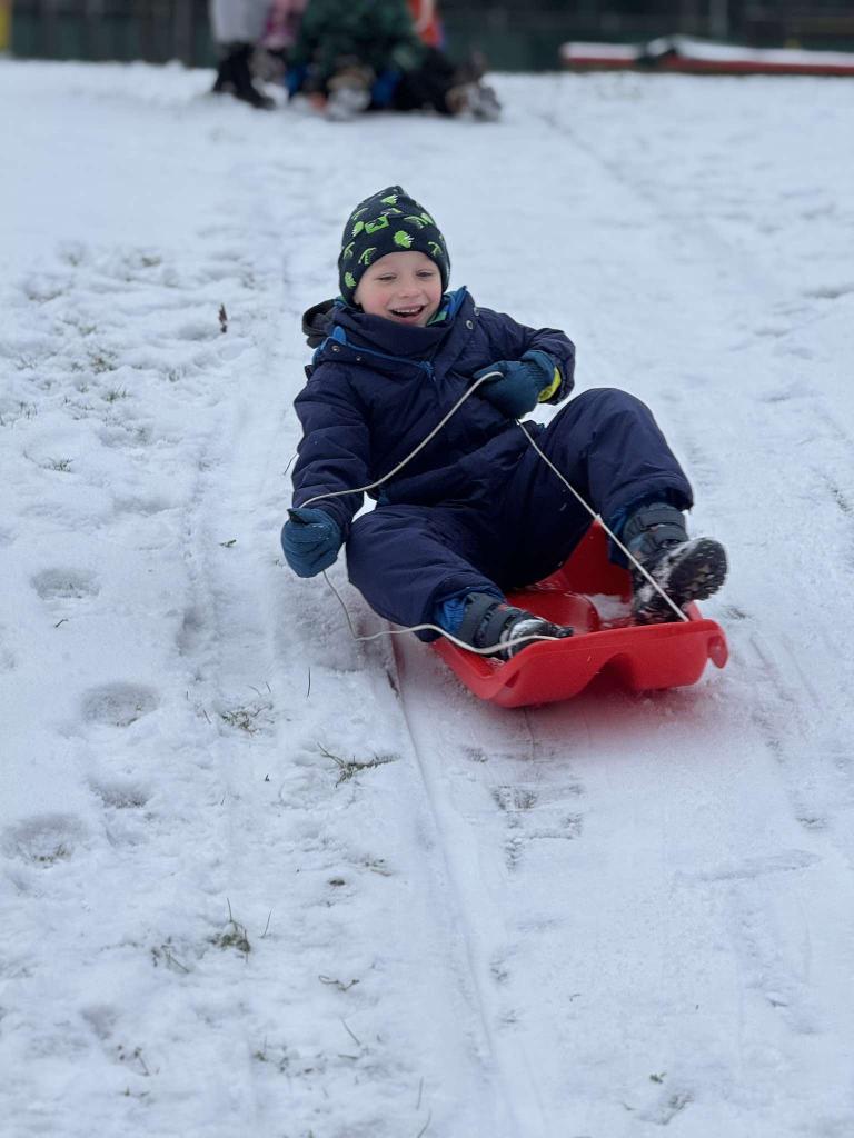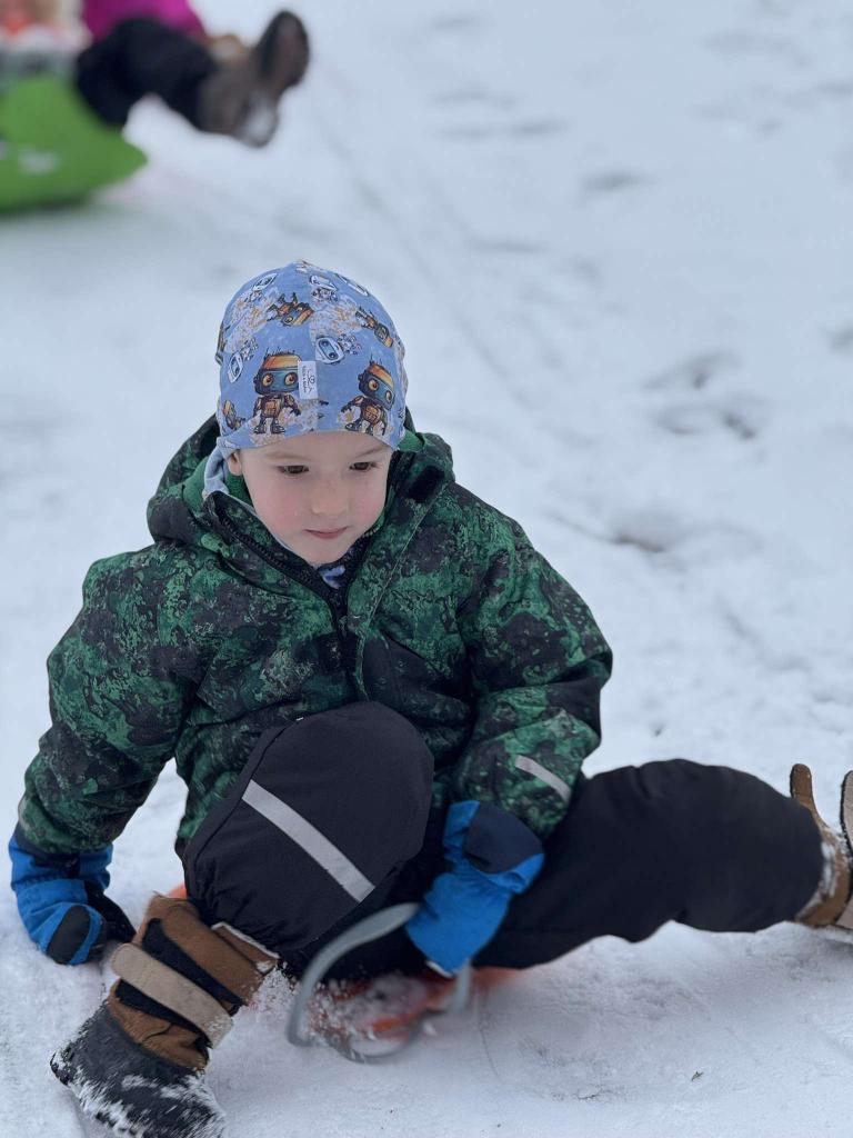 Jedou sáňky, na nich děti,